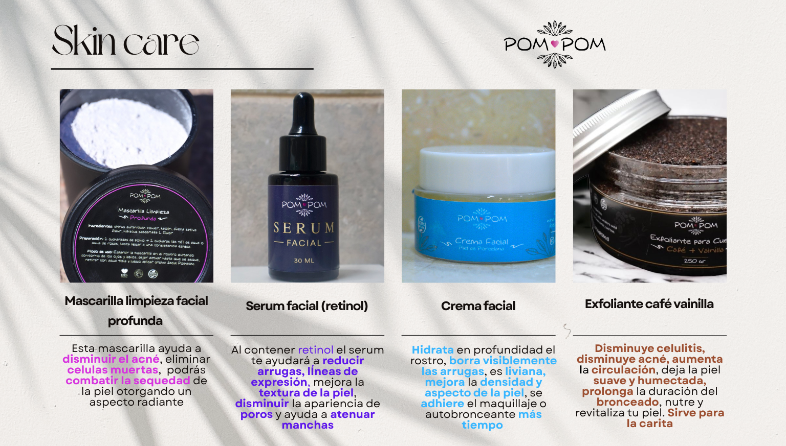 Productos para el cuidado de la piel, todos los productos PomPom están hechos con muchísimo amor dado que son los mismos productos que uso yo. Todo comenzó dado que tengo piel muy sensible a químicos, por lo tanto decidí hacer cosas 100% naturales para así poder utilizarlos sin problema.